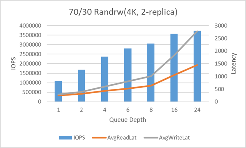 图4:4KB数据块,2副本,70/30混合随机读写性能测试结果
