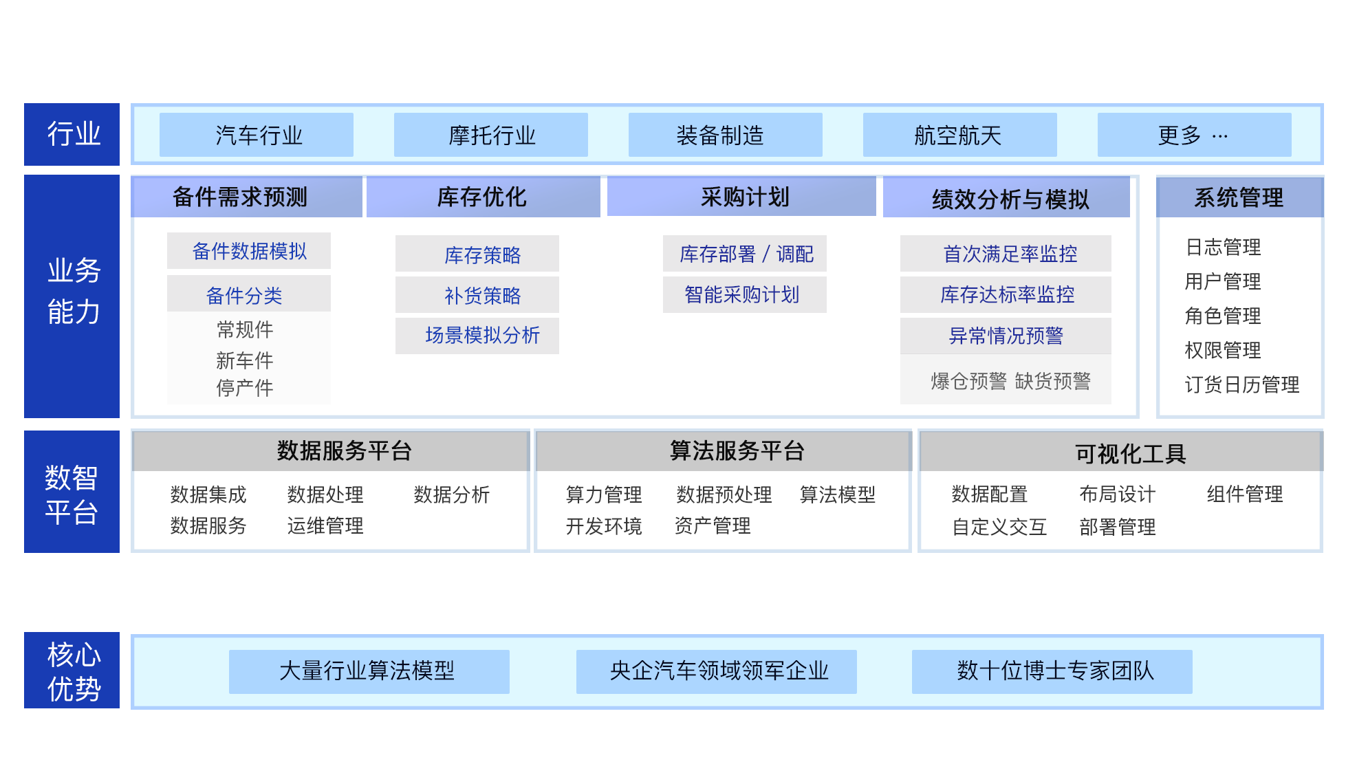 围绕备件业务场景,打造四大业务功能领域,为别为:备件需求预测、库存优化、采购计划、绩效分析与模拟,以数智平台为基础三大引擎为支撑,打通售后备件供应链上下游,助力售后业务全方位提升。