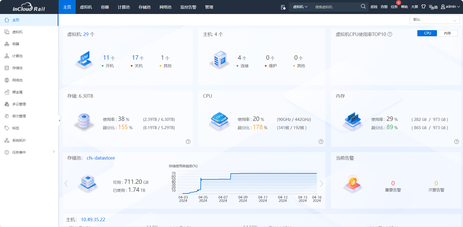 采用自主研发、基于 KVM 深度定制的计算虚拟化软件 InCloud Sphere,支持资源预留、热添加、GPU 直通、vGPU、USB Over IP、 DRS、DRX、裸机管理、虚拟录影机、磁盘双活等多种高级特性